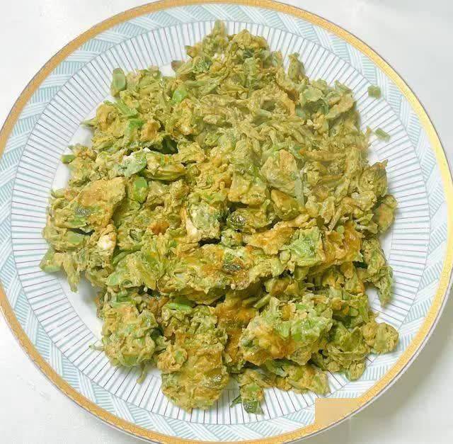 6. 热锅凉油,油量稍多一些,油热后倒入香椿蛋液。
