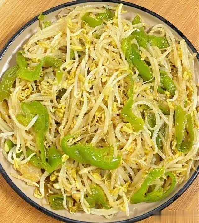 3. 快炒豆芽:转大火,倒入豆芽、青椒丝快速翻炒1分钟至豆芽变透明。