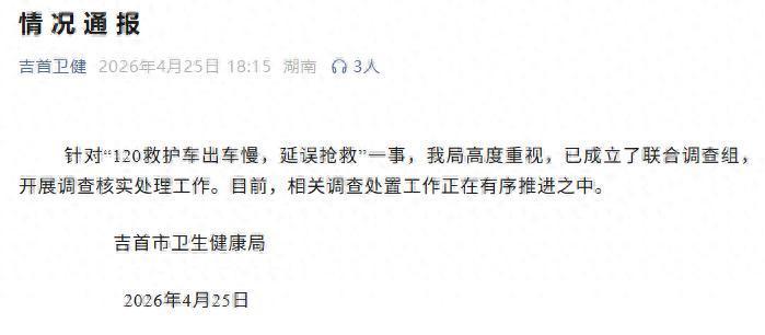 针对“120救护车出车慢,延误抢救”一事,我局高度重视,已成立了联合调查组,开展调查核实处理工作。目前,相关调查处置工作正在有序推进之中。